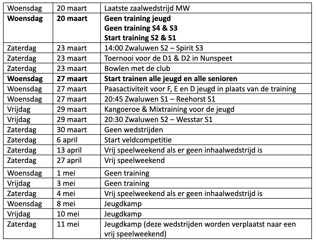 Het zaalseizoen zit er bijna op. Aan de midweek de eer om de laatste wedstrijd van het zaalseizoen te spelen aanstaande woensdag. We gaan naar het veld toe. Niks is zo lekker als in de frisse buitenlucht bij ons eigen clubhuis te spelen! In de afbeelding een overzicht met data wanneer de trainingen starten en andere belangrijke activiteiten op het veld zijn.